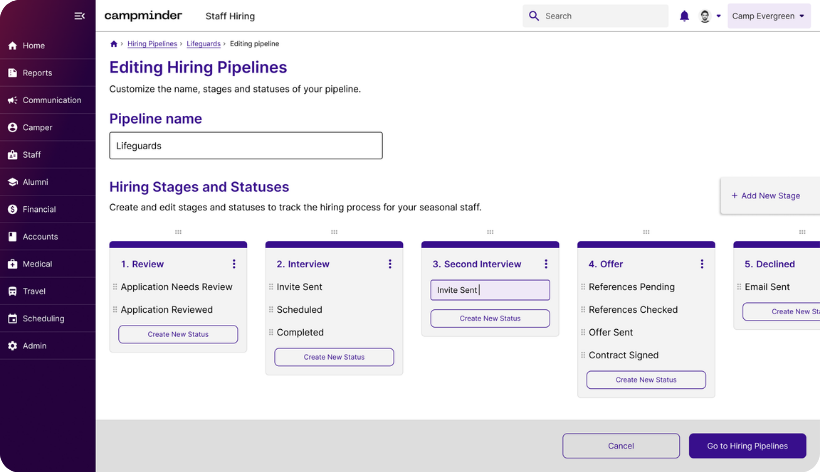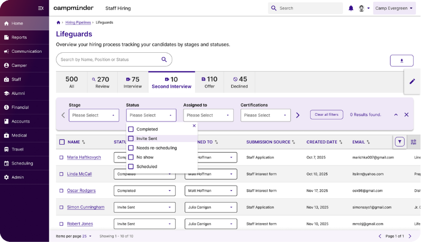 At-a-glance stage counts (In Review, Offer Sent, Hired, Declined) and work queues keep team focused during peak season. Applicant data flows from Campminder into the ATS automatically—no copying, pasting, or syncing chores.